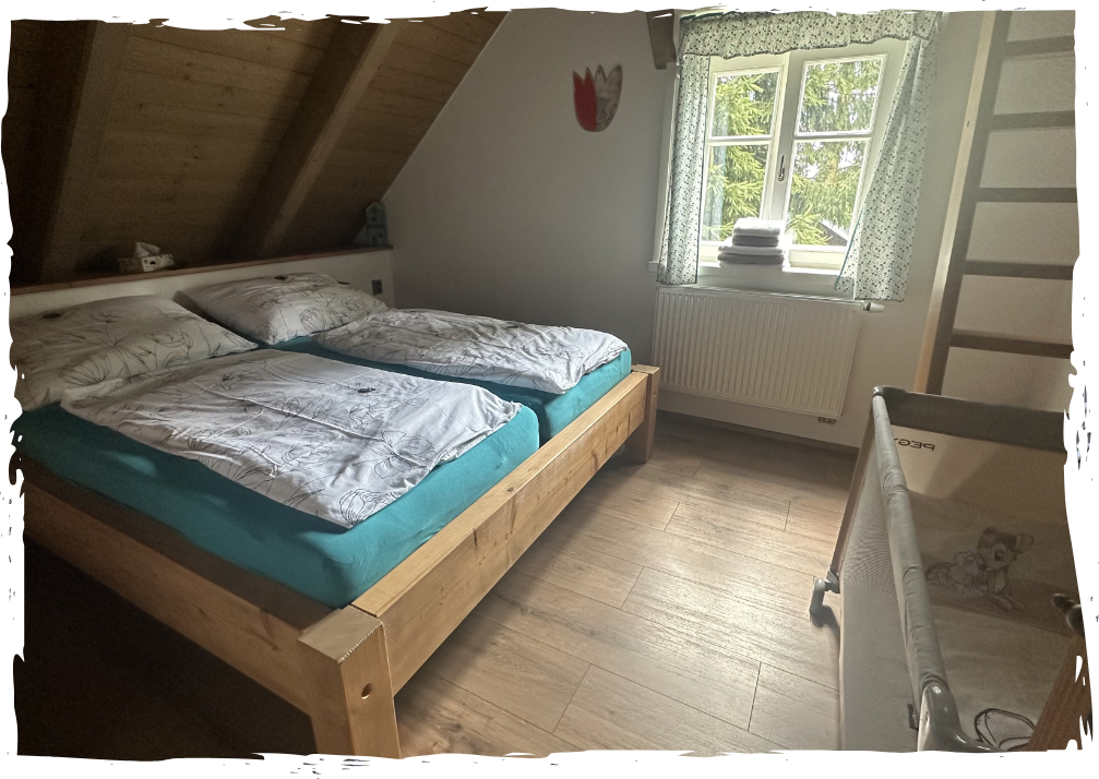 Dětská postýlka s povlečením, židlička na jídlo. V roce 2025 pro děti chystáme rozšíření dětského hřiště a domku v koruně stromu. Postavíme u potoka velké týpí,, ve kterém si budou moc děti hrát a odpočívat, ale ti odvážní i přespat.